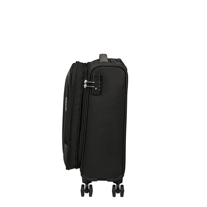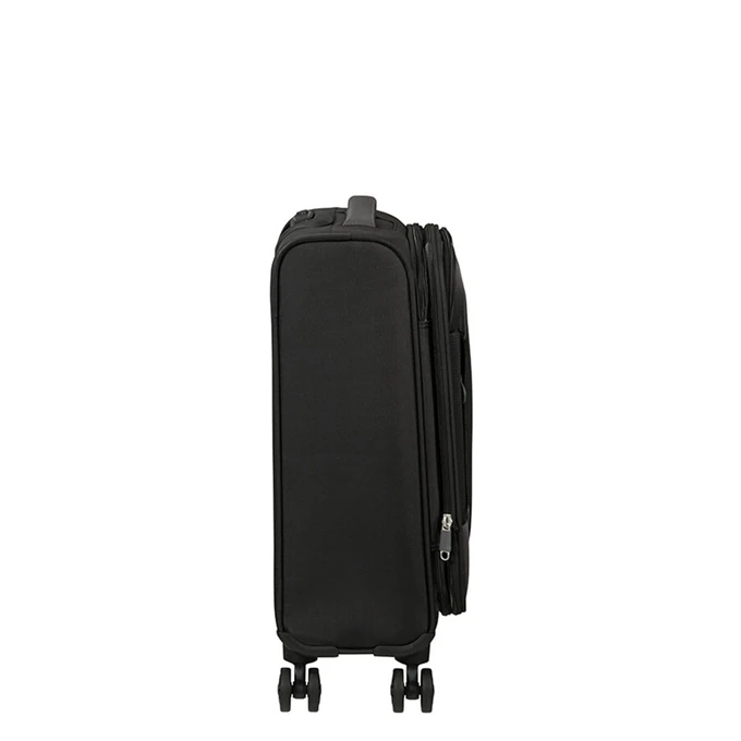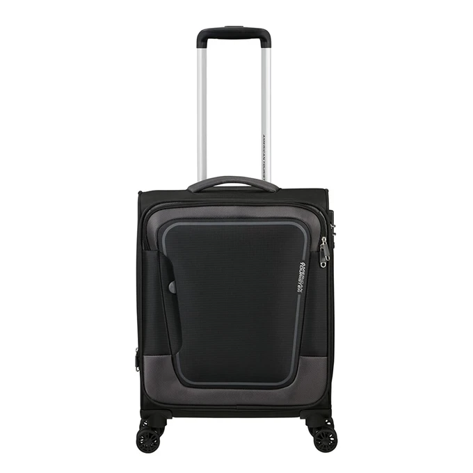 Op zoek naar een zachte koffer die geschikt is als handbagage? Dan is deze zachte koffer van American Tourister uit de Pulsonic serie wellicht precies waar je naar op zoek bent. Deze zachte koffer is gemaakt van polyester en op deze American Tourister koffer krijg je 2 jaar garantie. Het grote voordeel van een handbagage koffer ten opzichte van een ruimbagagekoffer is de snelheid en het gemak van je reis. Geen eindeloze wachtrij bij de incheckbalie voorafgaand van je vlucht en niet wachten op je koffer bij de bagageband op het vliegveld van bestemming. Deze American Tourister koffer is voorzien van 4 wielen en wordt daarom ook wel een spinner koffer genoemd. Ten opzichte van een koffer met 2 wielen is een spinner koffer wendbaarder en kun je deze rechtop laten staan tijdens het vervoeren.