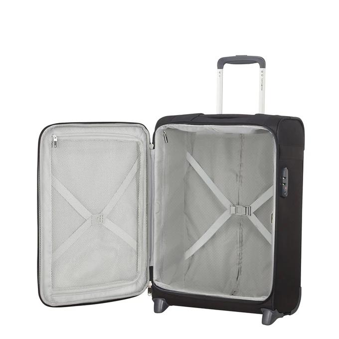 De Citybeat Upright 55 is van handbagage formaat waardoor hij mee aan boord mag van het vliegtuig. Bagage berg je op in het ruime hoofdvak dat aan de binnenzijde is voorzien van gekruiste pakriemen en een intern ritscompartiment. Een klein ritsvak op de voorzijde is ideaal voor het bewaren van eigendommen die je tijdens het reizen dicht bij de hand wilt houden. Een TSA-cijferslot zorgt ervoor dat bagage veilig is opgeborgen waardoor je zorgeloos kunt reizen. Daarnaast reis je zeer comfortabel dankzij twee soepele wieltjes en een meertrapse trekstang.