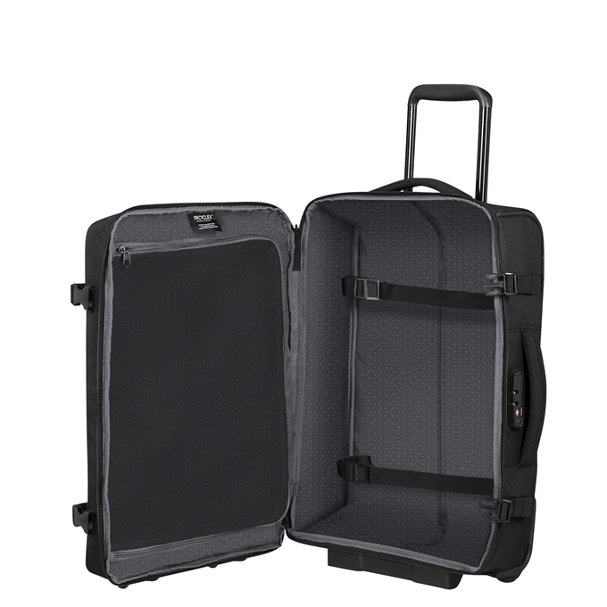 Deze Samsonite duffle is gemaakt van een gerecycled materiaal genaamd rPET. Het materiaal rPET wordt gemaakt door het recyclen van petflessen. Hiermee krijg je niet alleen een duurzaam maar ook een sterk materiaal.